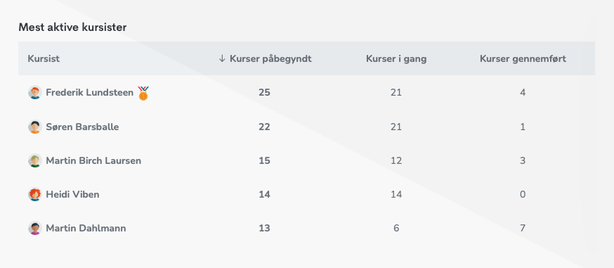 Billedet ovenfor er fra GoLearn’s gratis LMS, hvor du nemt kan følge med i, hvem der er de mest aktive kursister (BTW, Go Frederik!)