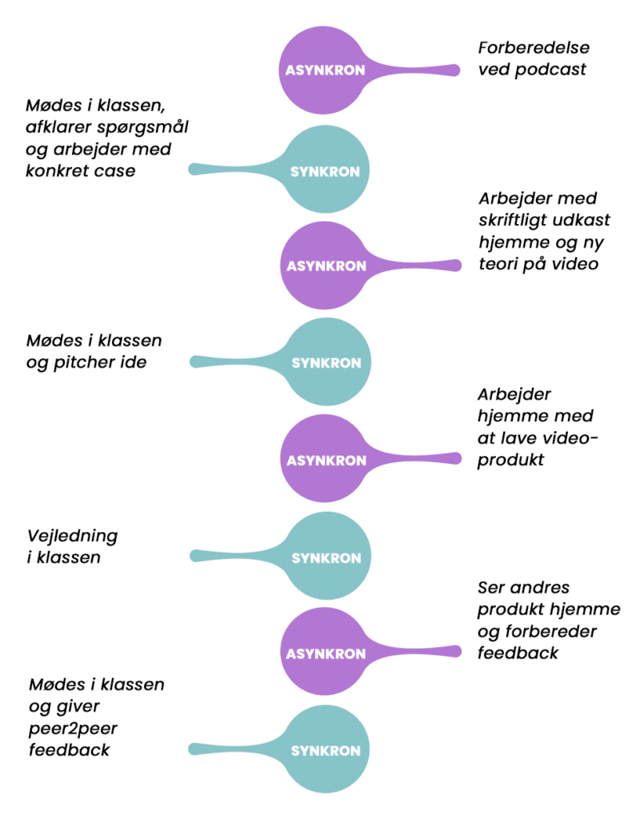Her kan du se et eksempel, hvor jeg selv har overvejet ovenstående punkter og lavet et blended undervisningsforløb med synkrone og asynkrone læringsaktiviteter: